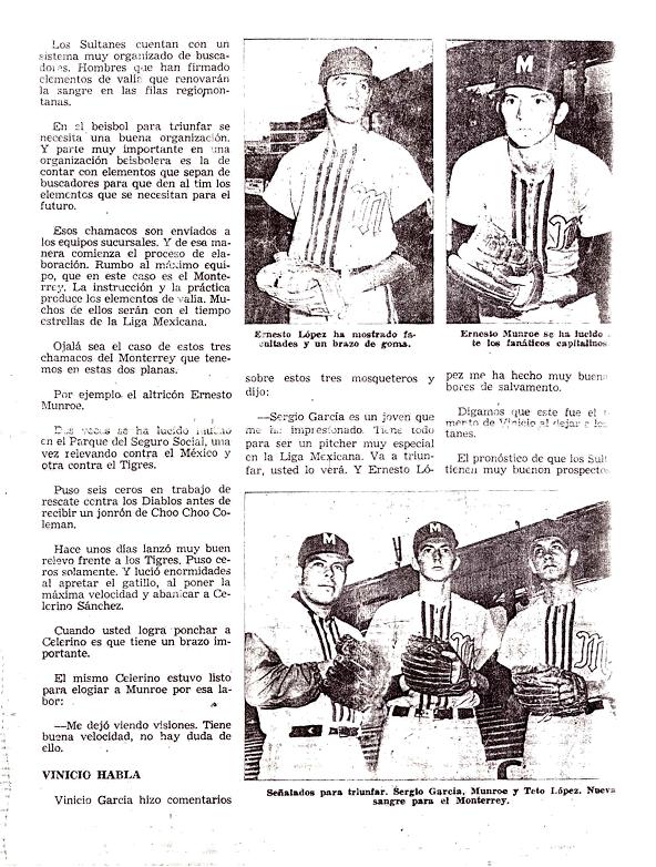 A Munro, como novato, le tocó lanzar en un staff que encabezaban José Ramón López, Luis Peñalver, Carlos Sánchez, Alfonso Cisneros, Alvarado y James Horsford; Espino seguía siendo la ley del tolete (ese año bateó .354) y a su lado figuraban tipos como Elpidio Osuna, Rigoberto Mena, Oliverio Sparks, Lorenzo “Carbonero” López, José Manuel Ortiz y Juan de Dios Villarreal. Vinicio García estuvo como mánager-jugador antes de pasar en esa misma campaña a los Tigres de México.