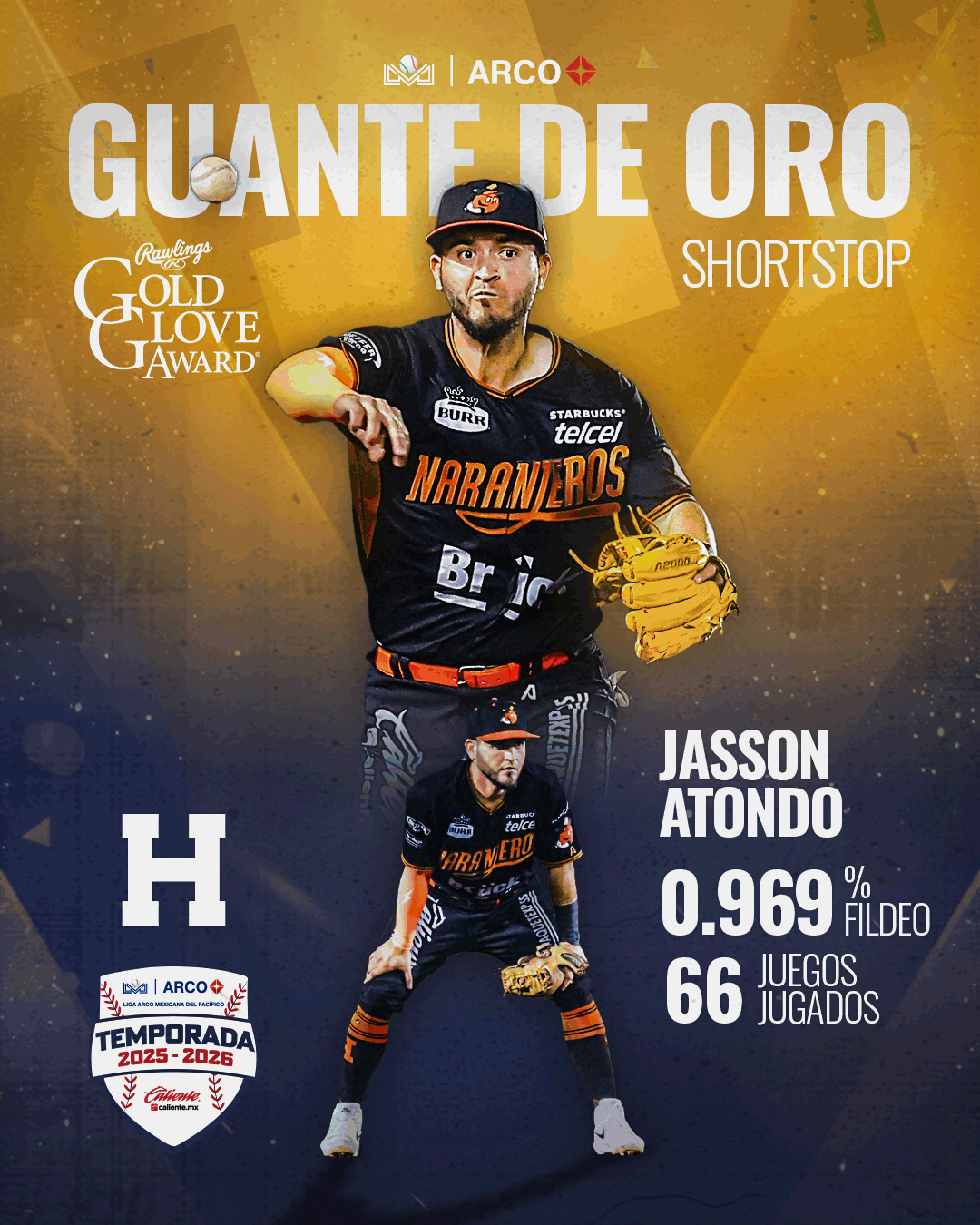 Finalmente, el infield del Rawlings Gold Glove Award, lo completa Jasson Atondo. El shortstop de los Naranjeros de Hermosillo tuvo 66 juegos, con 261 oportunidades y cometiendo 8 errores, para tener su porcentaje de fildeo en .969.