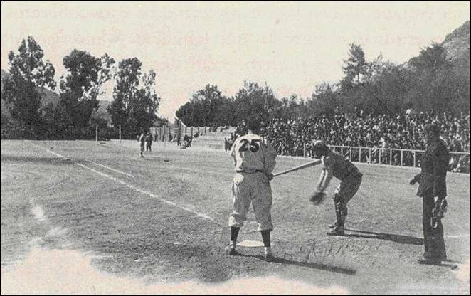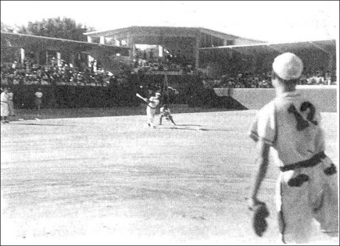 Estadio de “La Casa Del Pueblo”, que después se llamo “Fernando M. Ortiz”, en un juego de La Liga Del Pacifico en 1945. A la derecha Herman Reich batea por Hermosillo frente a Mazatlán |